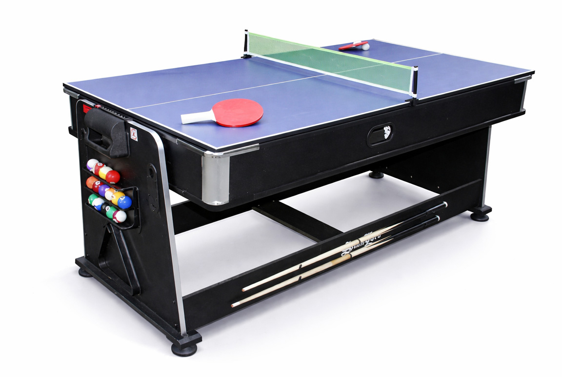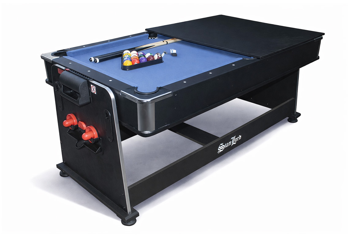 Poolbordet byder på en klassisk og autentisk spilleoplevelse med blå filtdug, justerbare ben og en solid spilleflade, der gør spillet stabilt og retfærdigt. Her er der plads til både hyggekampe og seriøse dueller, hvor hvert stød tæller, og taberen selvfølgelig skal hente snacks. Når poolkøerne lægges fra sig, er det bare at skifte topplade – og så er scenen sat til næste disciplin.