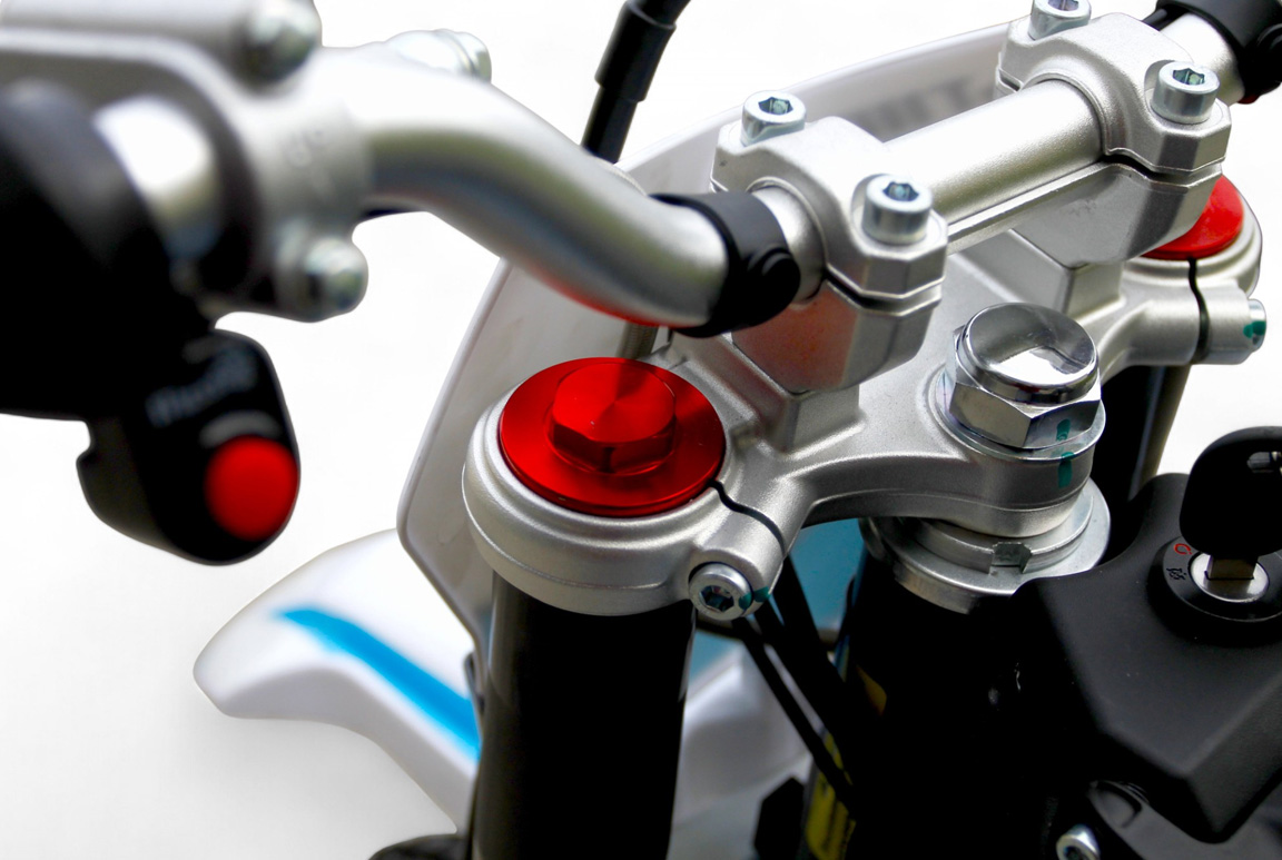 Affjedringen er lige så gennemtænkt som bremsesystemet. Foran finder du en stærk 600mm hydraulisk forgaffel, der opsuger de små slag og ujævnheder på vejen, så kørslen føles stabil og kontrolleret. Bagpå sidder en robust 280mm bagstøddæmper, som sørger for at baghjulet holder sig solidt plantet i jorden, selv når barnet kører over rødder, sten eller grus. Resultatet er en dirtbike der står ekstremt stabilt, giver selvtillid og gør kørslen mere komfortabel – også når tempoet stiger, eller terrænet bliver mere udfordrende.