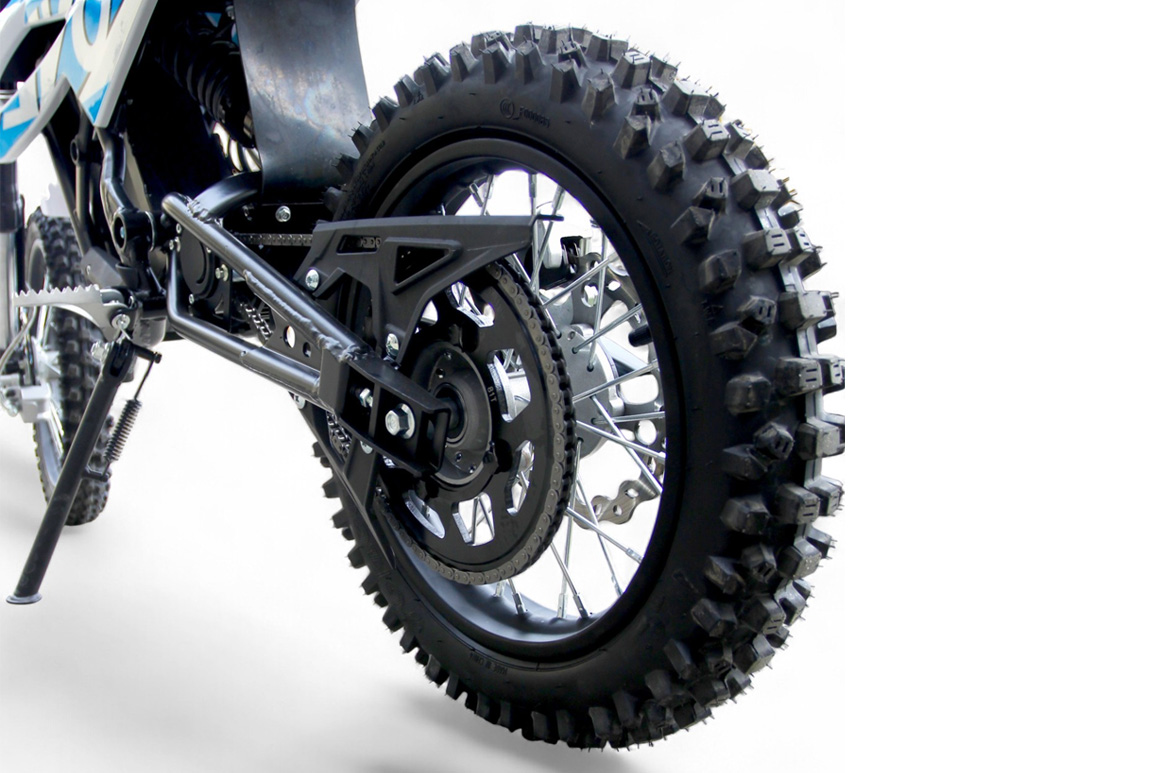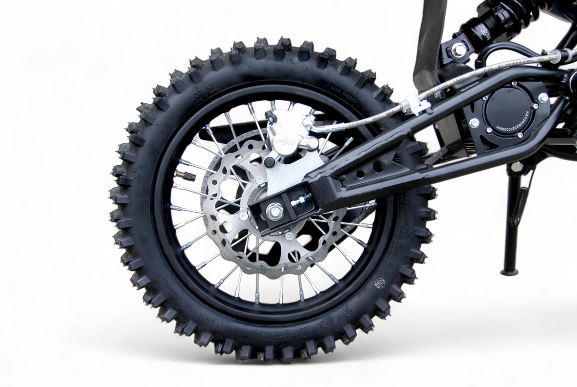 Denne Kayo eT110 Dirtbike er udstyret med en avanceret brushless DC-motor, der leverer nominelt 1000W og op til 2500W peak ydelse. Denne motor er temperaturkontrolleret, hvilket sikrer stabil output selv ved hård belastning – og den sørger for lynhurtig acceleration, så barnet mærker “rigtig” off-road-power allerede ved første start.