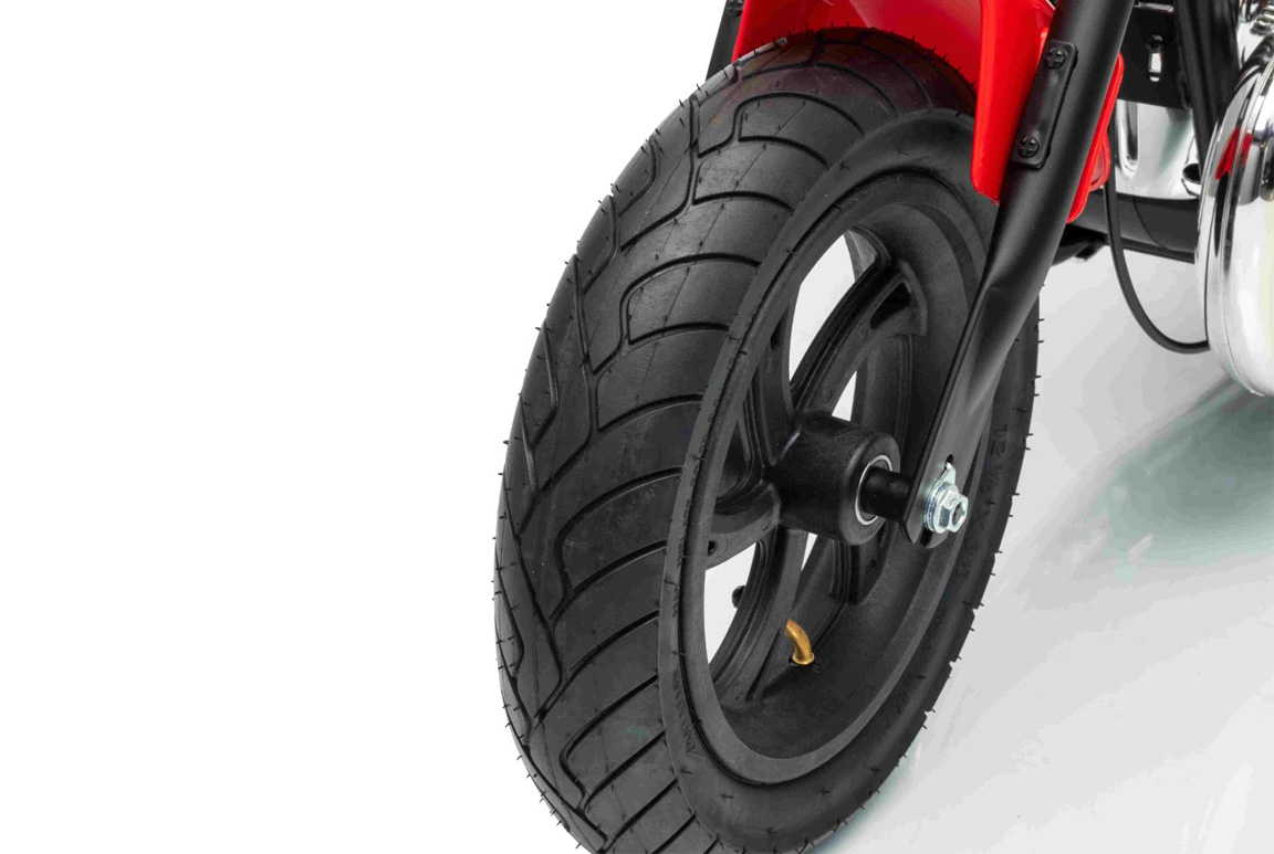 De luftfyldte gummihjul spiller en afgørende rolle for den realistiske oplevelse. I modsætning til hårde plastikhjul absorberer de små ujævnheder i underlaget og giver både bedre vejgreb og en mere behagelig kørsel på asfalt, fliser og faste grusarealer. Resultatet er en mere stabil og naturlig kørefornemmelse, som øger både sikkerhed og kontrol.