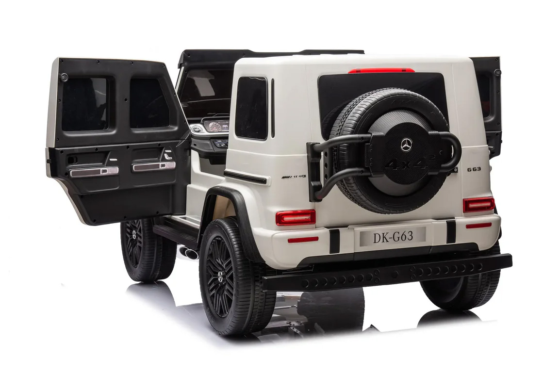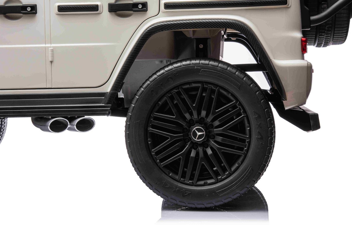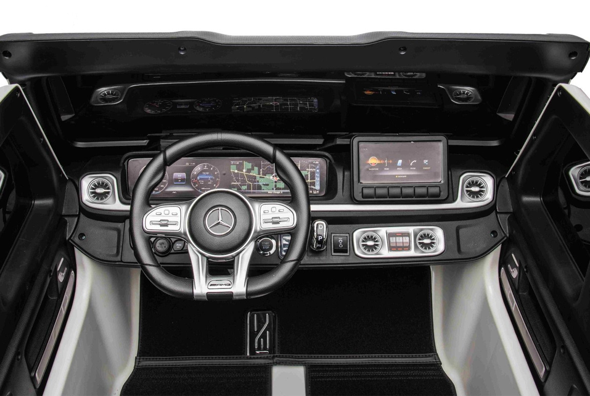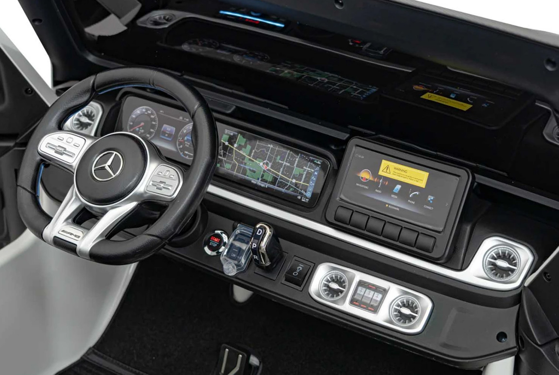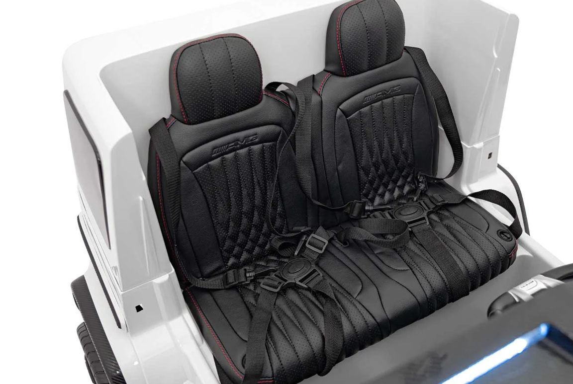Med plads til to børn i de luksuriøse AMG-lædersæder kan køreturen nydes sammen med en ven eller søskende. Komforten er i top og bilen er langt fra de klassiske elbiler med hårde plastikhjul. Denne G63 AMG XXL “Extreme” er udstyret med store, ægte EVA-gummihjul, som giver markant bedre vejgreb, mindre støj og en langt mere behagelig kørsel. Det detaljerede og gennemførte instrumentbord med masser af knapper og funktioner, kombineret med de luksuriøse AMG-gulvmåtter fuldender følelsen af at sidde i en ægte bil – bare i børnehøjde.