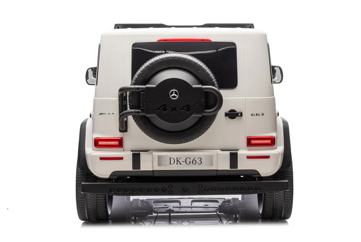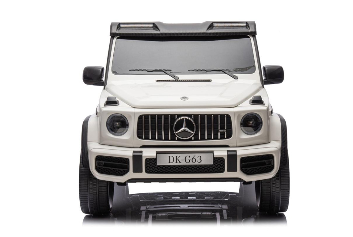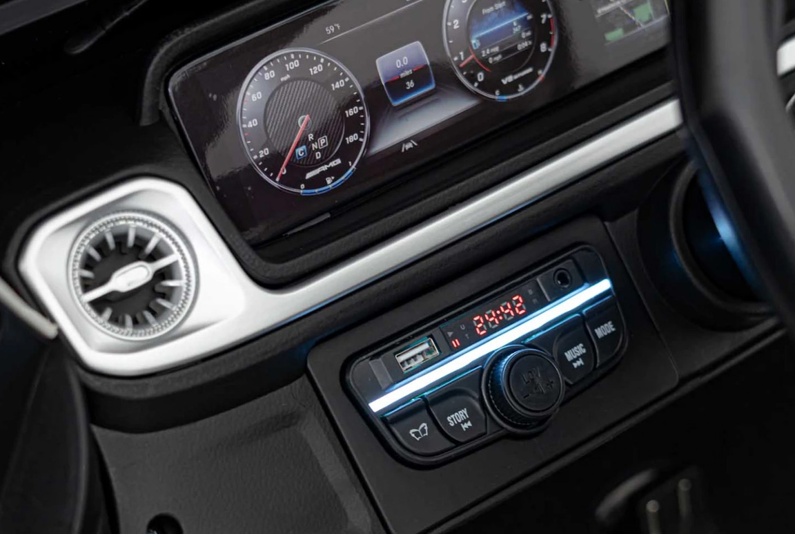 Vores Mercedes G63 AMG XXL “Extreme” garanterer timevis af underholdning og mere end et par misundelige blikke fra nabolagets øvrige juniorbilister – og med garanti også fra fædrene. Det store indbyggede multimedieanlæg med flere tilslutningsmuligheder – herunder MP3, AUX, FM-radio og Bluetooth – gør det muligt at cruise rundt til yndlingsmusikken med armen nonchalant i karmen. Og som prikken over i’et gemmer der sig under fronthjelmen et smart, hemmeligt opbevaringsrum, perfekt til snacks, bamser eller legetøj, med god plads i størrelsen L: 45 × B: 35 × H: 24 cm.