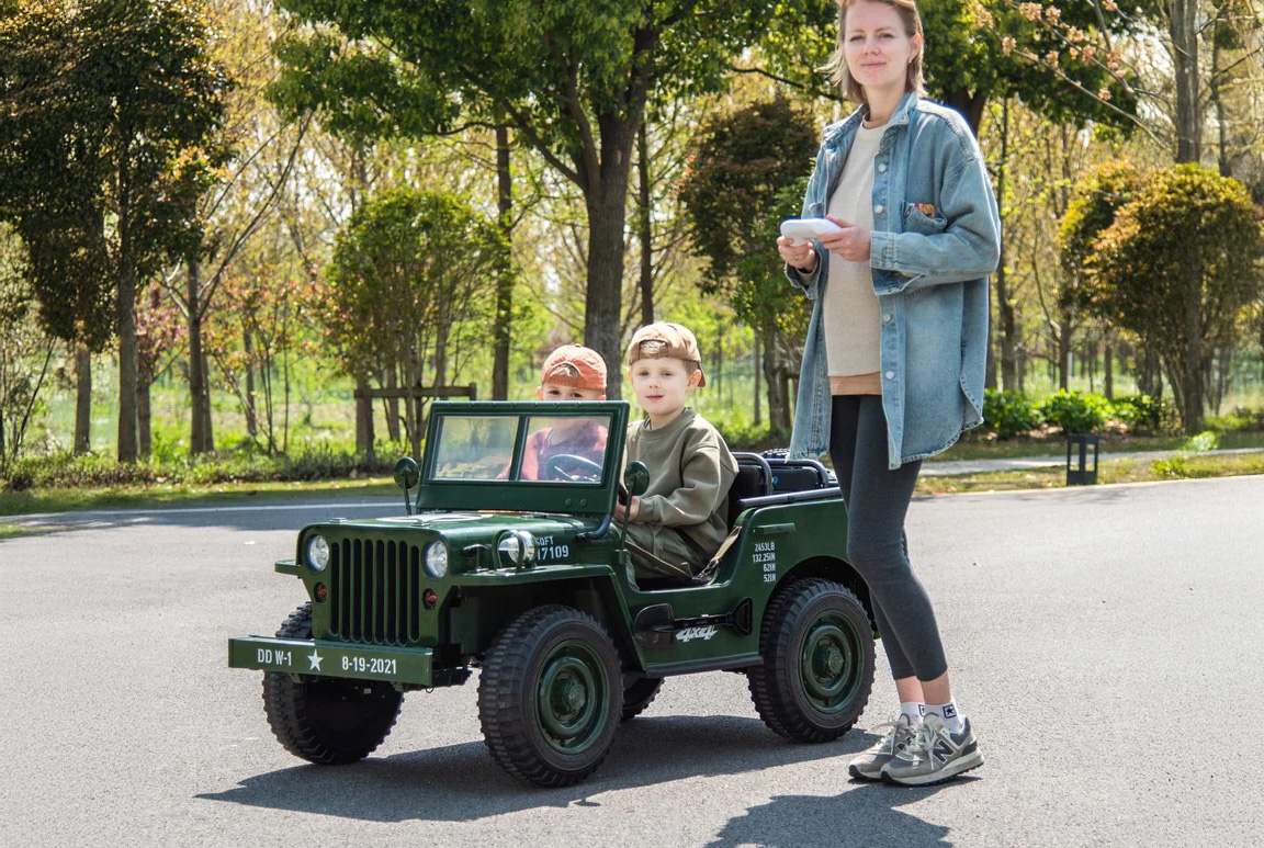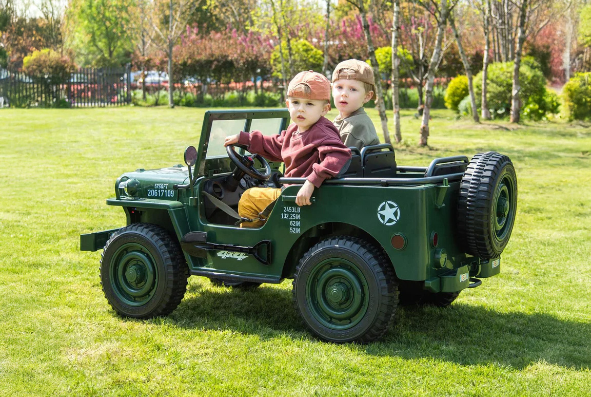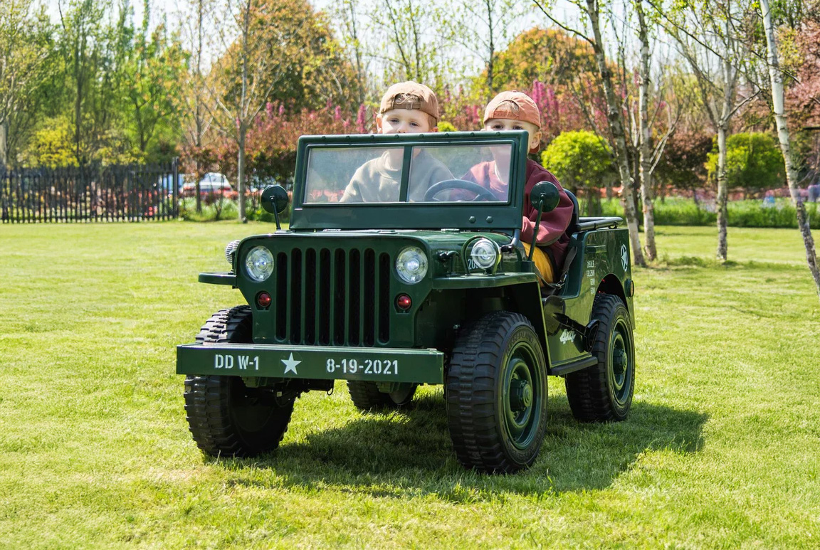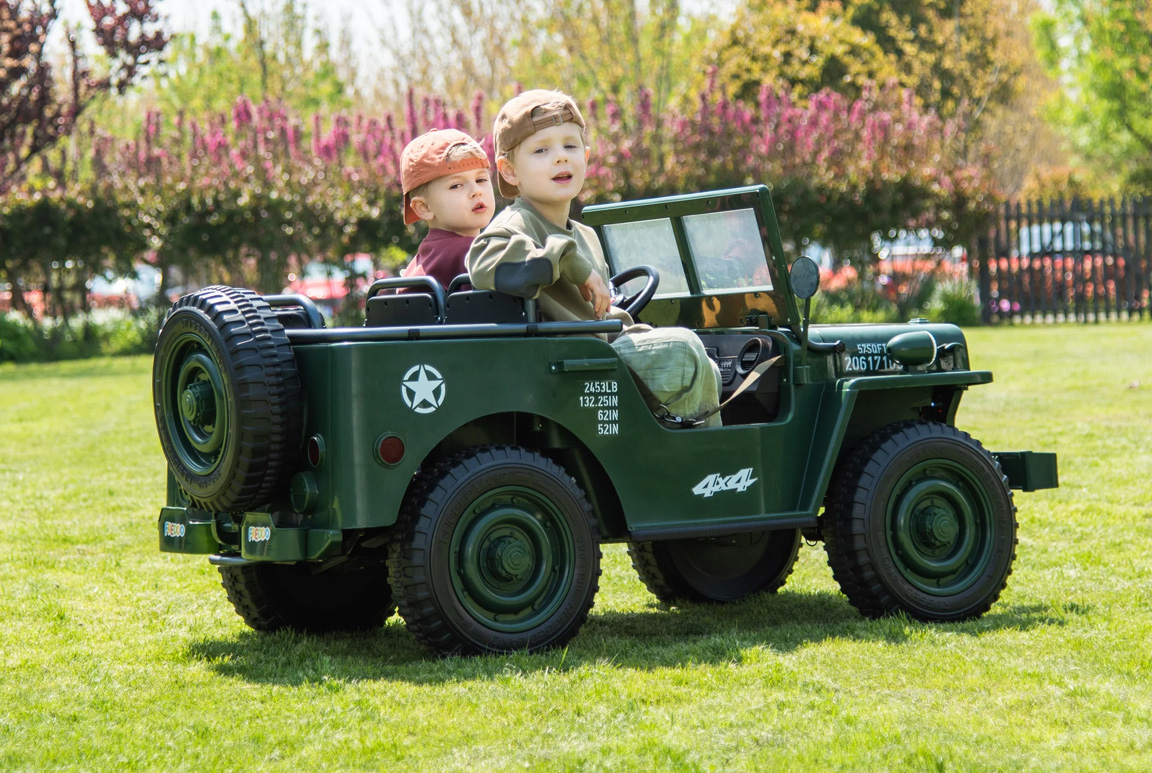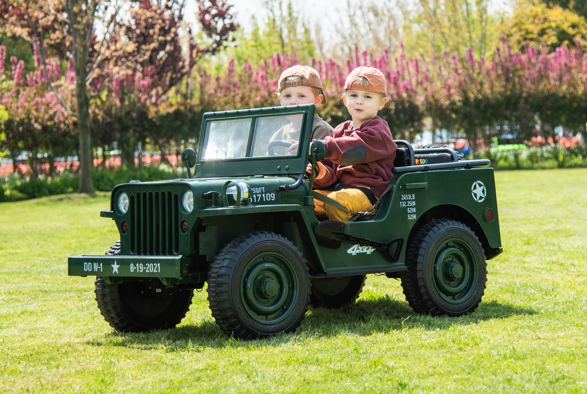 Forældrene kan være helt rolige når de lukker deres guldklump(er) ud på mission. Den leveres nemlig med soft-start funktion og sikkerhedsseler. Selvom det er en Militær Jeep til benhårde kadetter, så prioriterer vi stadig sikkerheden, så både forældrene og ikke mindst børnene kan nyde køreturen med ro i sindet.