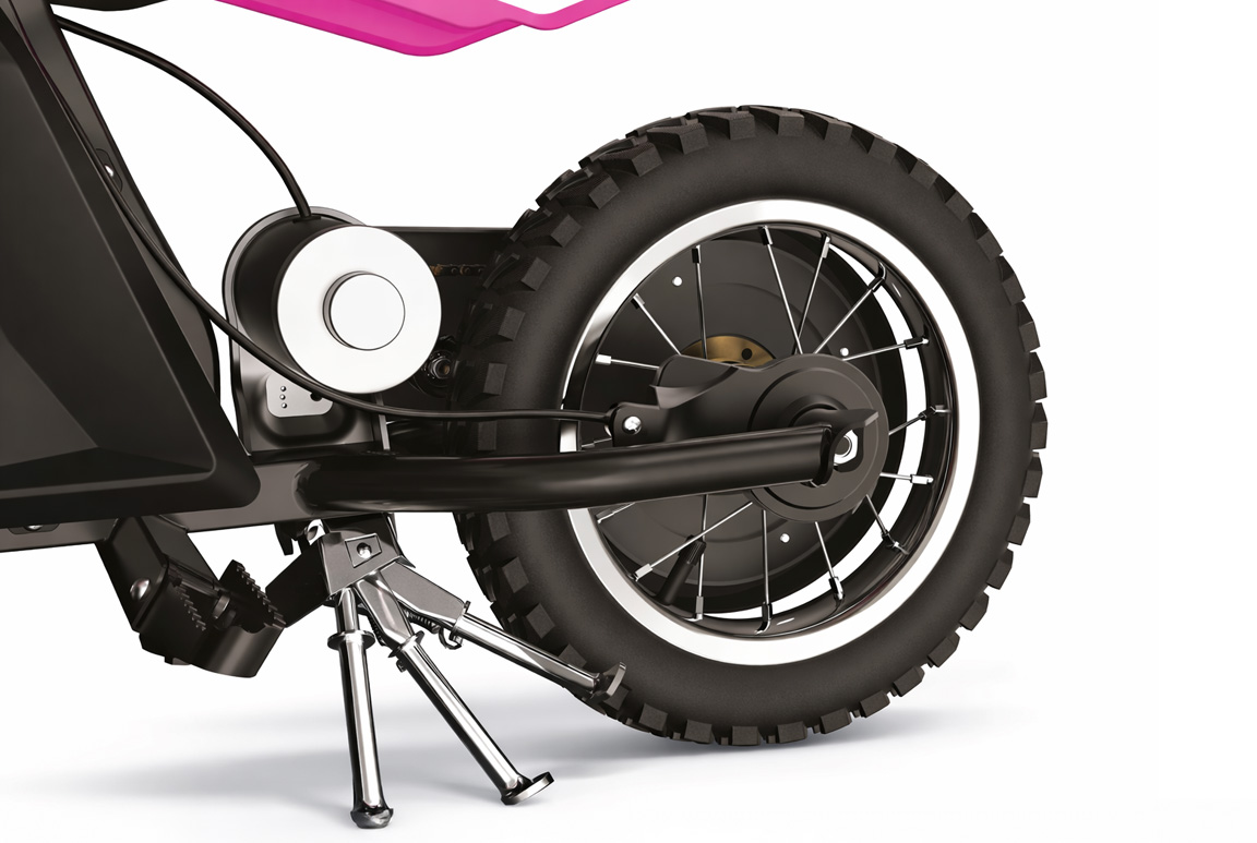 Vores pink Razor Dirt Rocket MX125 er bygget med et kraftigt stålstel og en forstærket tværstang på styret der sikrer ekstra høj kvalitet og sikkerhed. Den er udstyret med 12″ egerhjul med luftfyldte terrændæk, som giver et sikkert greb på ujævne underlag, og så har den endda også et foldbart støtteben for nem parkering.
