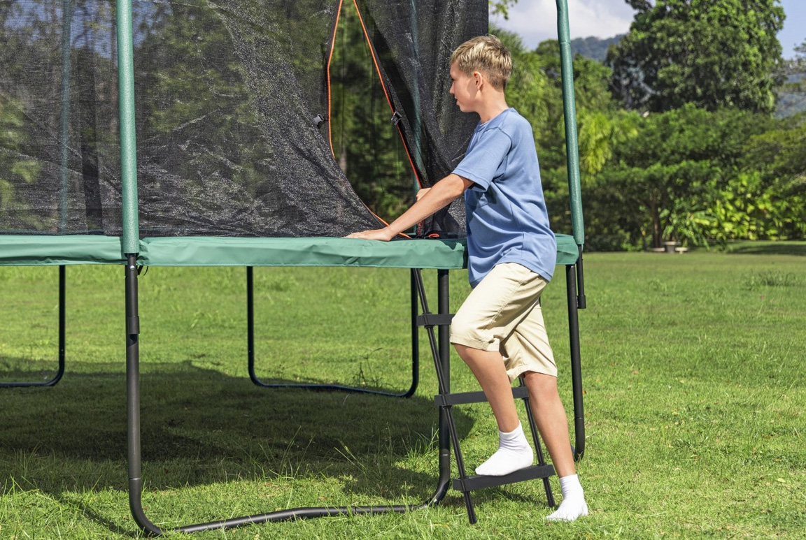 De skumpolstrede stænger beskytter mod hårde overflader, mens den stabile konstruktion giver en solid og sikker base for hvert eneste hop. Samtidig medfølger en praktisk 89 cm høj stige, som gør det nemt og sikkert for både børn og voksne at komme op og ned fra trampolinen – en vigtig detalje i hverdagen, hvor tilgængelighed og komfort gør en forskel. Resultatet er en havetrampolin, hvor sikkerhed, funktionalitet og brugervenlighed går op i en højere enhed – så både børn og forældre kan føle sig helt trygge under legen.
