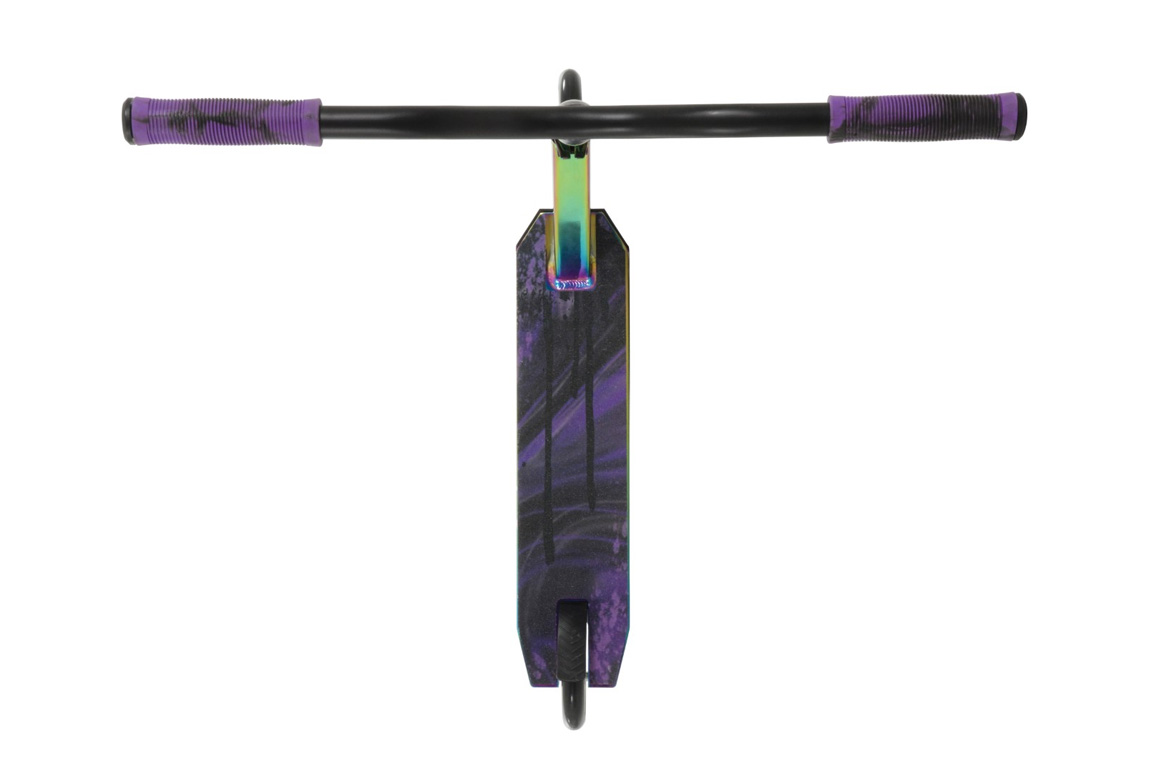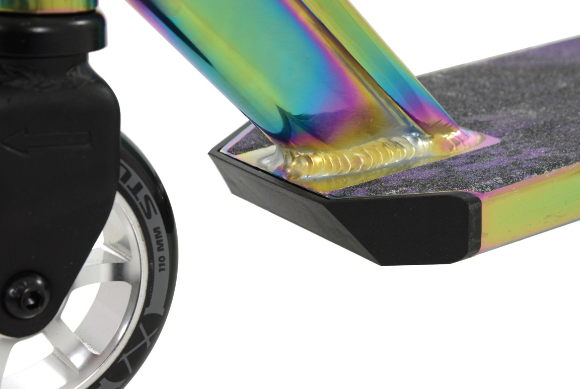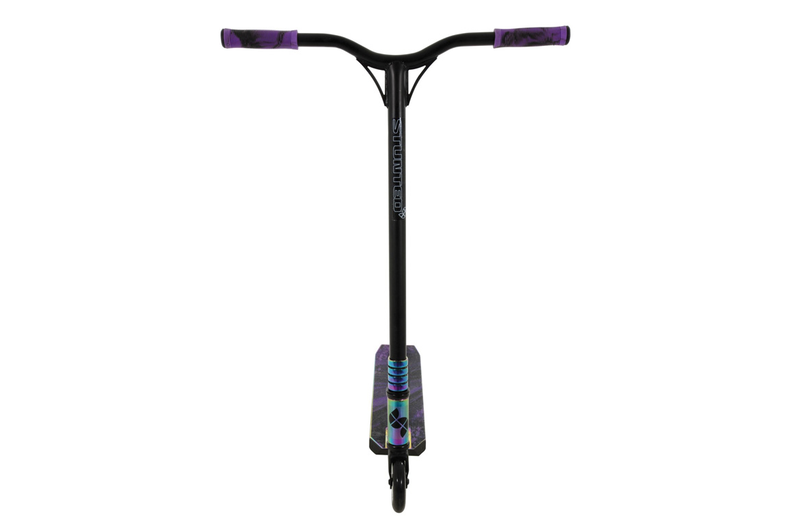 Med en stærk V-formet aluminiumskonstruktion og ét-styks styr får du et løbehjul, der kan holde til hop, spins og hverdagsbrug uden at give op. Den pro-grade quad-klemme sørger for, at styret bliver, hvor det skal – også når det hele går lidt hurtigt. Det lette 6063 aluminium box-deck gør det lettere at lande dine tricks – og beskytter samtidig anklerne mod uheldige slag.