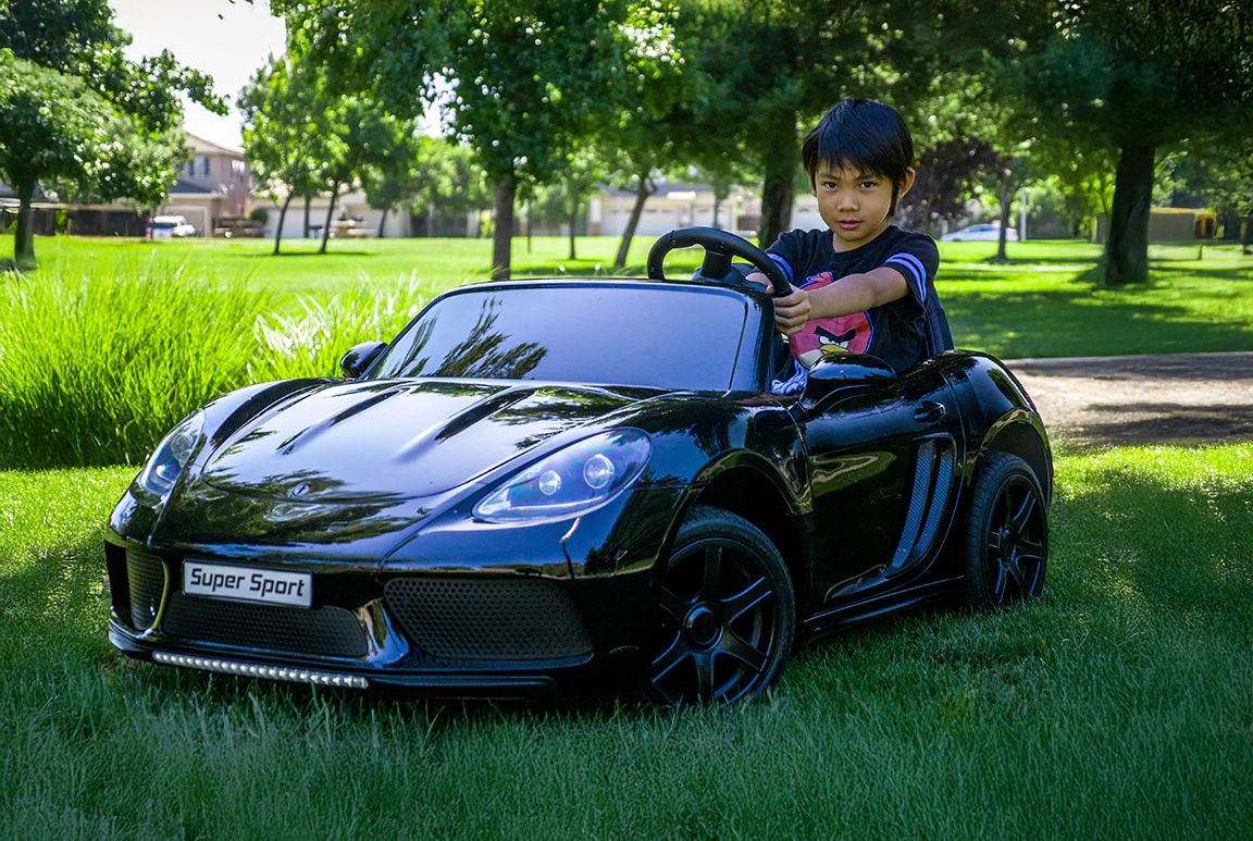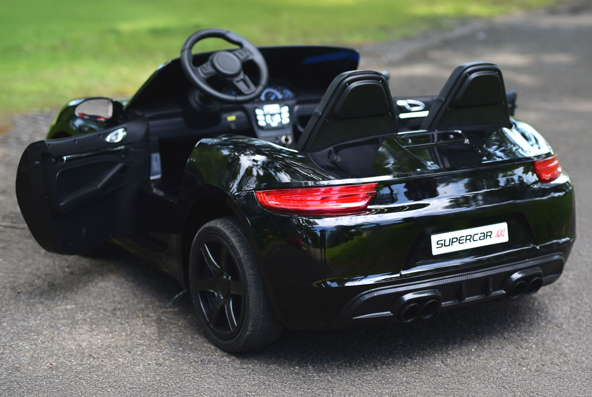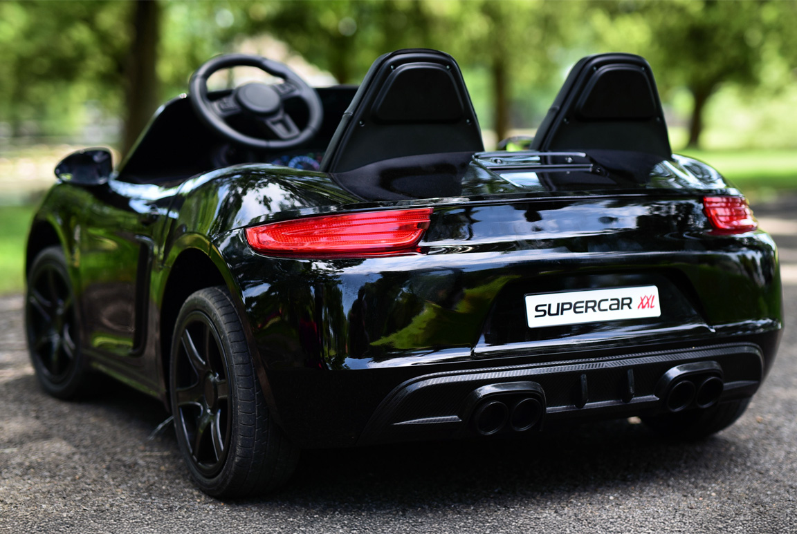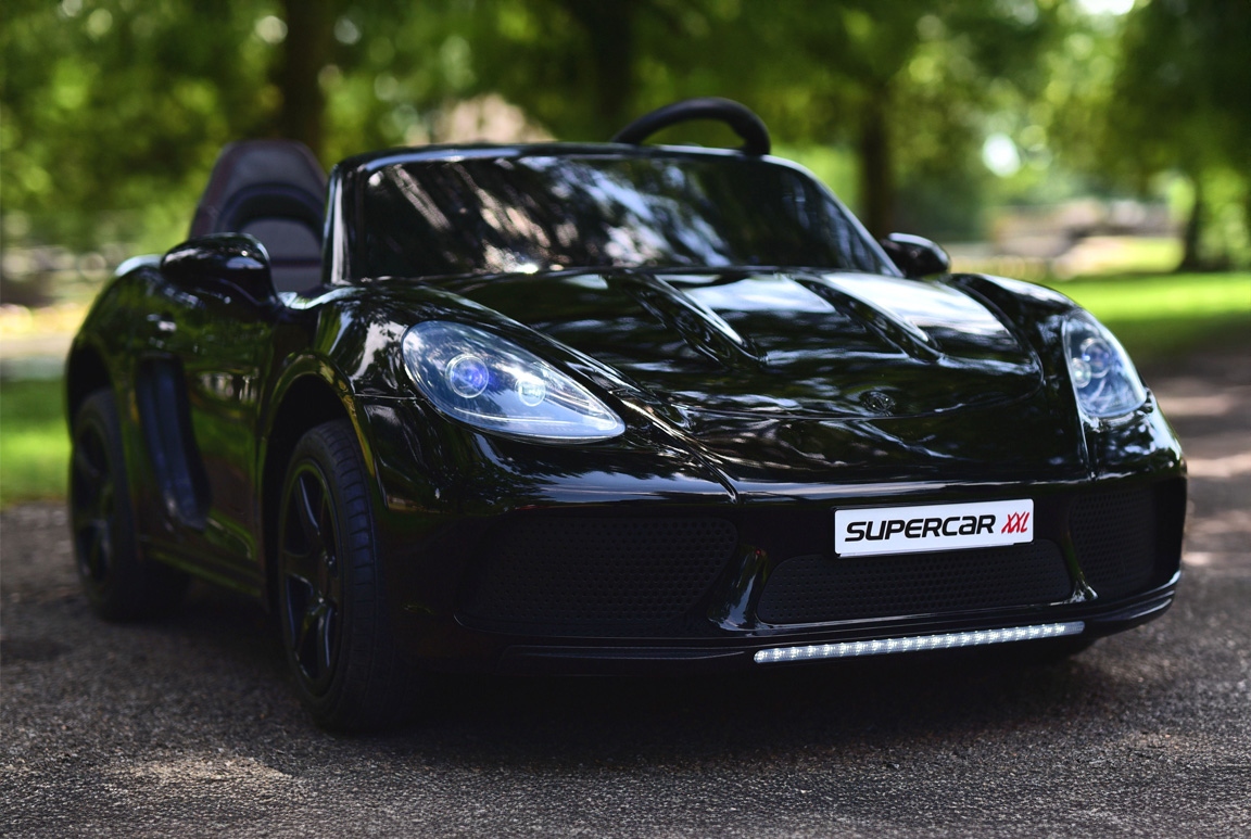 Vi præsenterer her markedets største sportsvogn, Super Sportscar XL, der er bygget og designet efter den legendariske Porsche Cayman. Denne elbil har plads til to børn eller ét barn og en voksen med en samlet vægt på hele 100 kg. (vi har endda set fuldvoksne mennesker køre i den og stadig have benplads). Med sin størrelse og vægtkapacitet er denne elbil i en liga for sig selv!