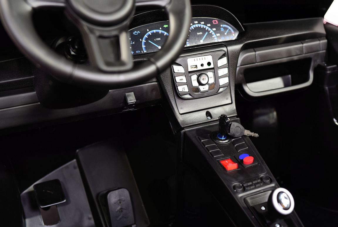 Men det er ikke alt, elbilen er også udstyret med den fedeste motorlyd ved opstart, LED-lys for og bremselys bagpå, power display, elektrisk horn, indbygget musikanlæg med flere forskellige tilslutningsmuligheder af bl.a. en telefon, MP3, AUX, USB m,m., så dit barn kan lytte til sin yndlingsmusik, mens han/hun cruiser rundt på tur.