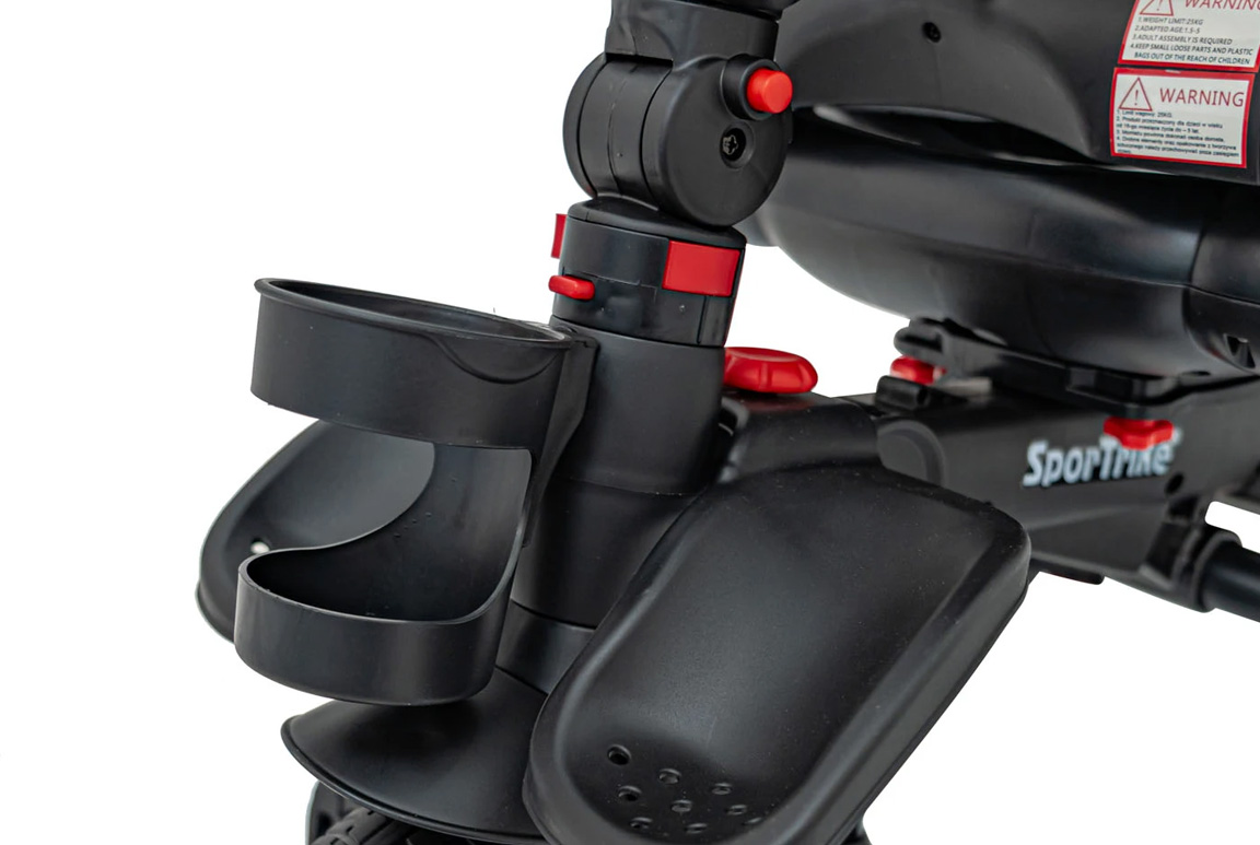 Vores SporTrike Rider trehjulet cykel med kaleche er fyldt med gennemtænkte detaljer, der hurtigt gør den til familiens foretrukne køretøj. Cyklen leveres med smarte kop- og flaskeholdere, så både vandflasker, kaffe-to-go eller sutteflasken altid er lige ved hånden – uanset om det er barnets eller forælderens drik, der skal transporteres.
